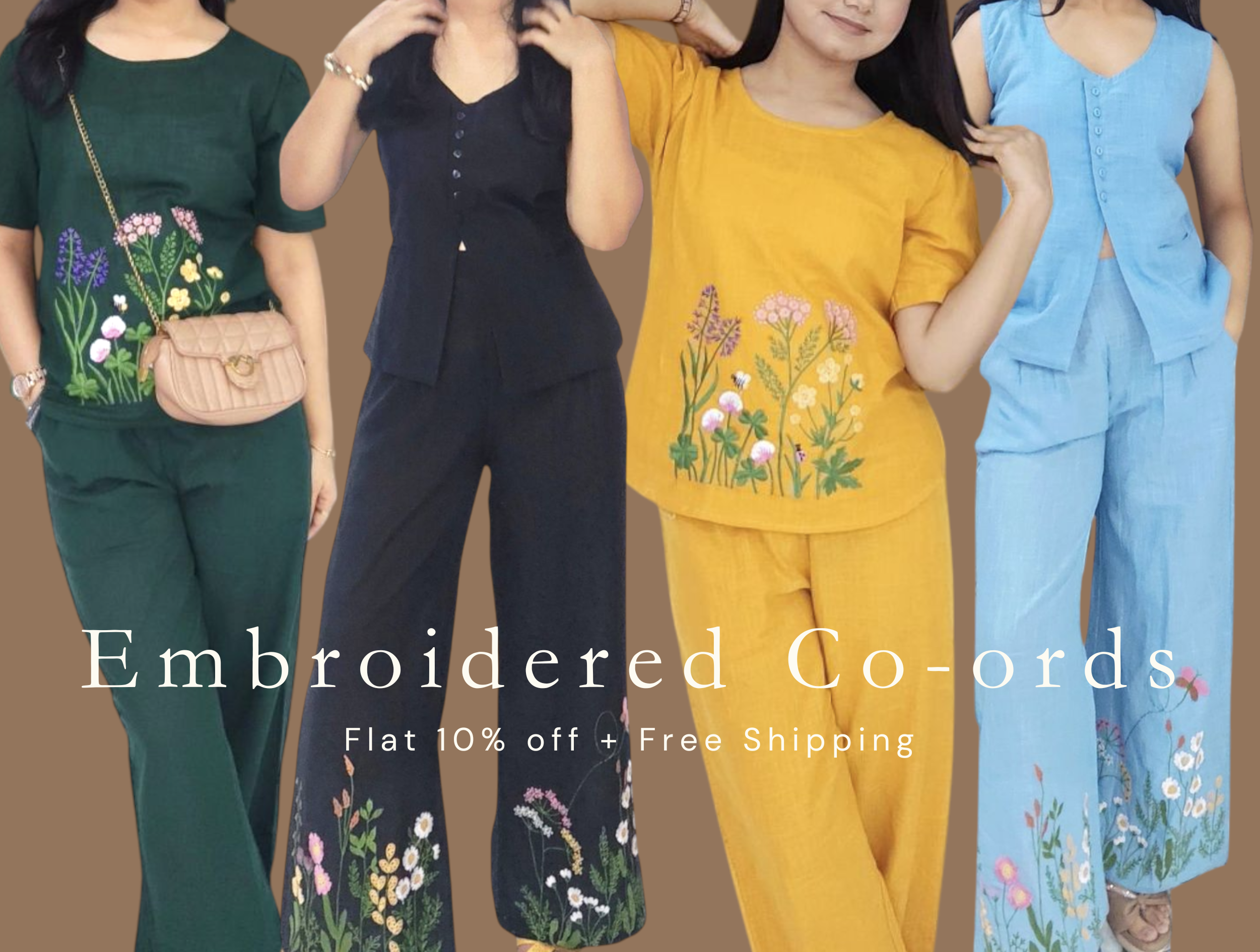 Ultra-breathable cotton with machine-embroidered white co ord set