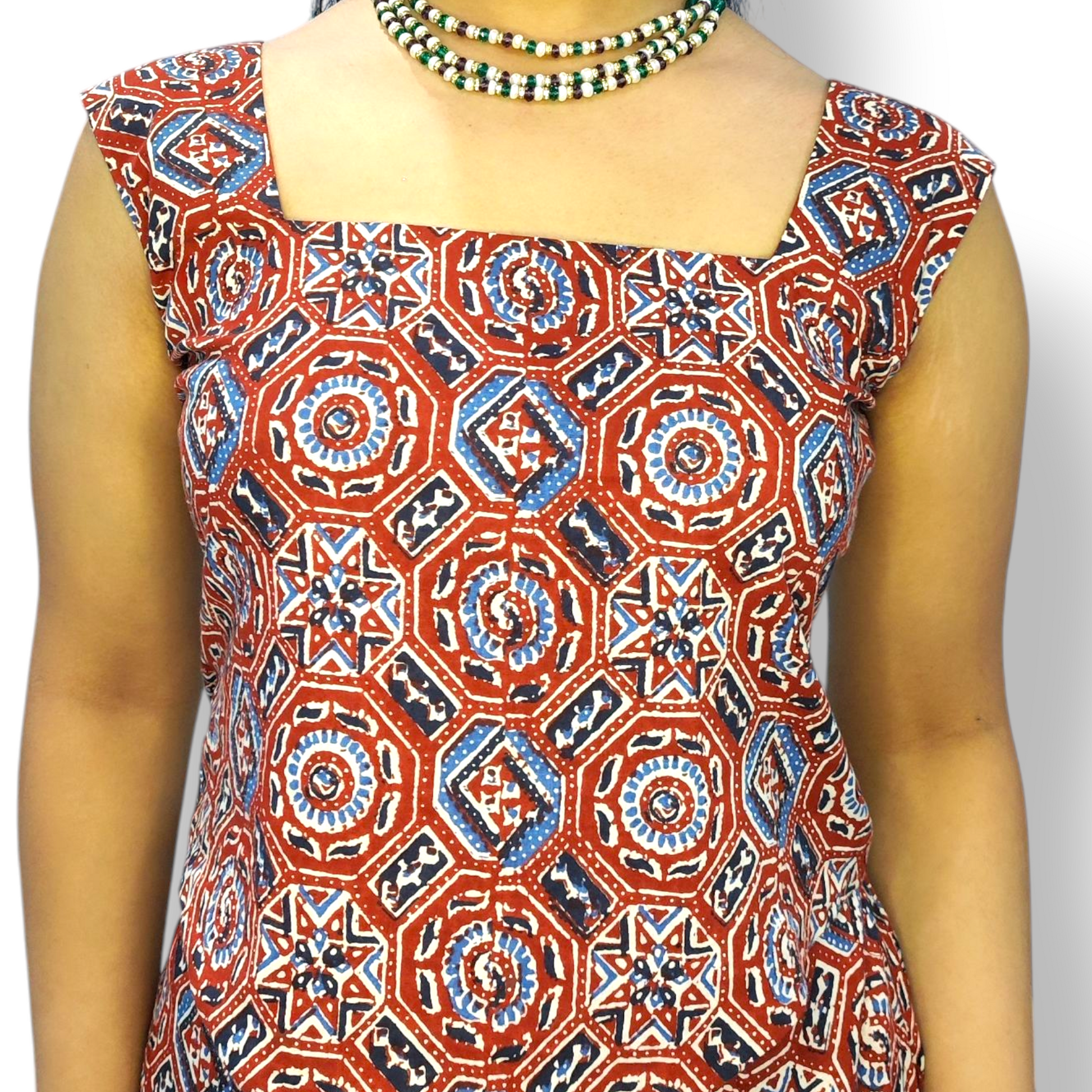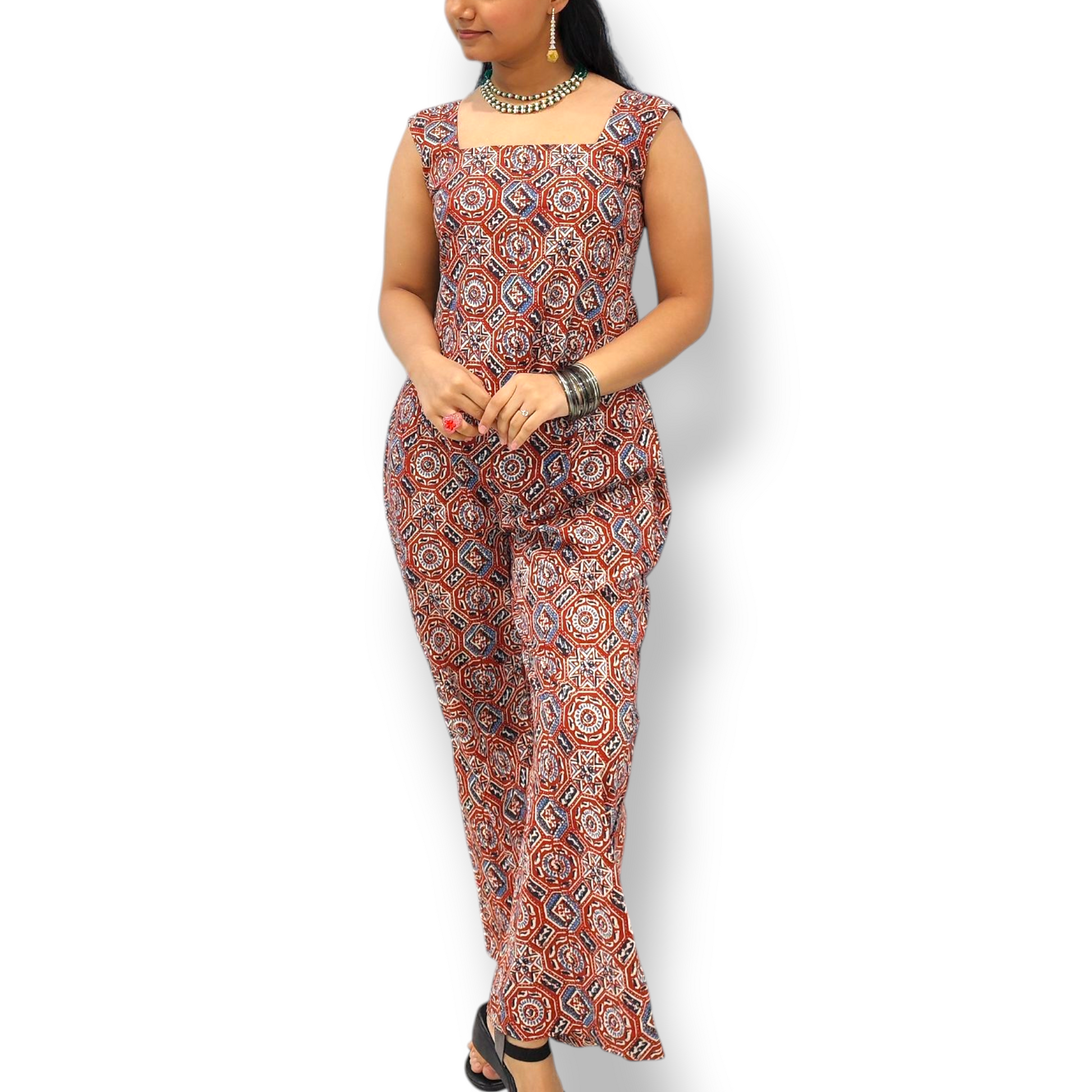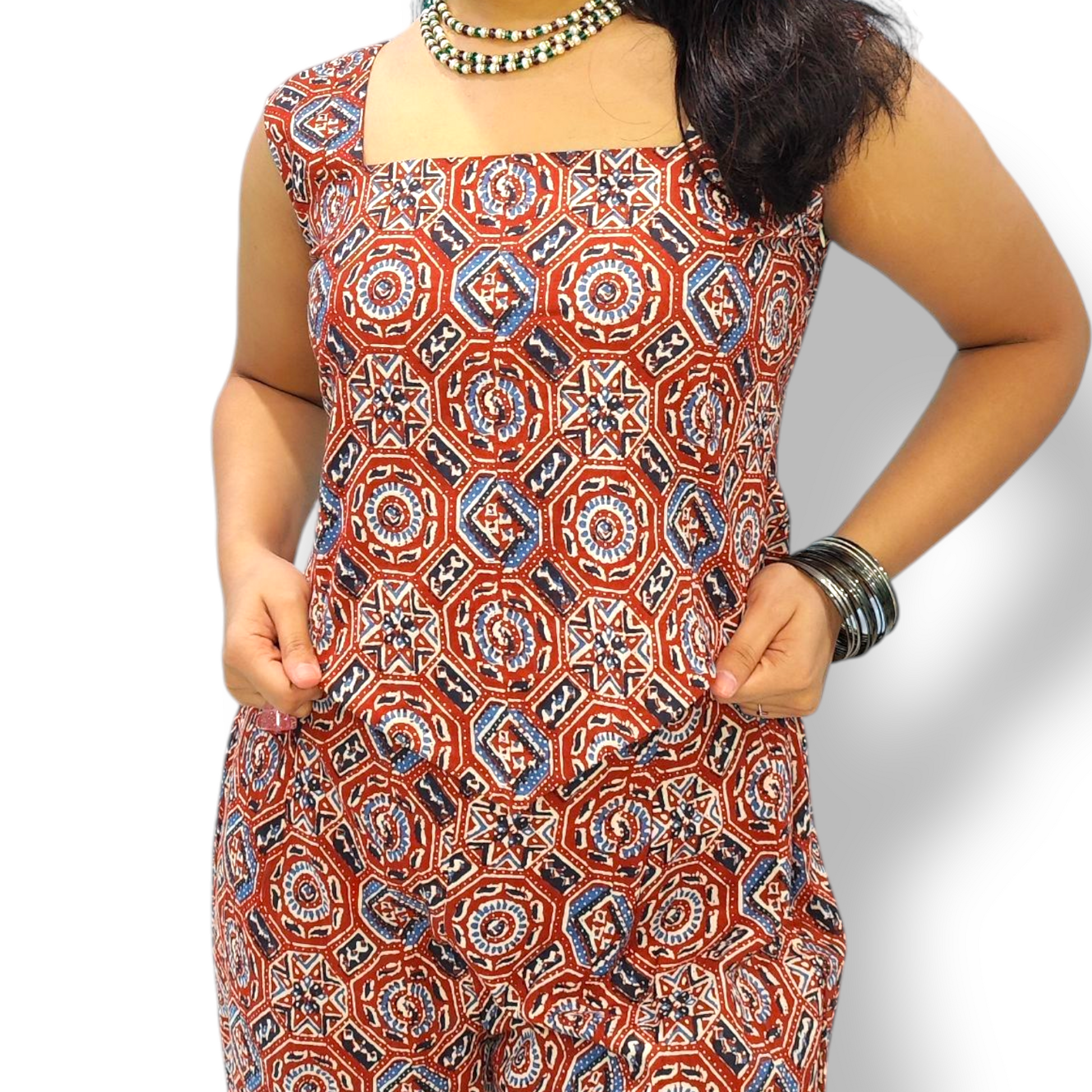 Introducing the Ajrakh Corset Co-Ord Set - a comfortable and chic ensemble made from pure cotton. The ajrakh print adds a unique touch to the stylish corset top and straight leg pants, which feature flat front and back elastic and convenient pockets. Elevate your fashion game with this must-have set.