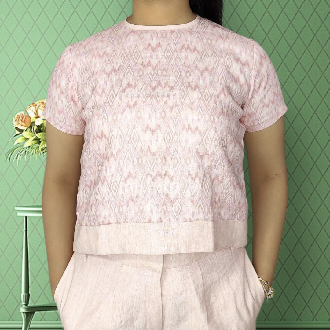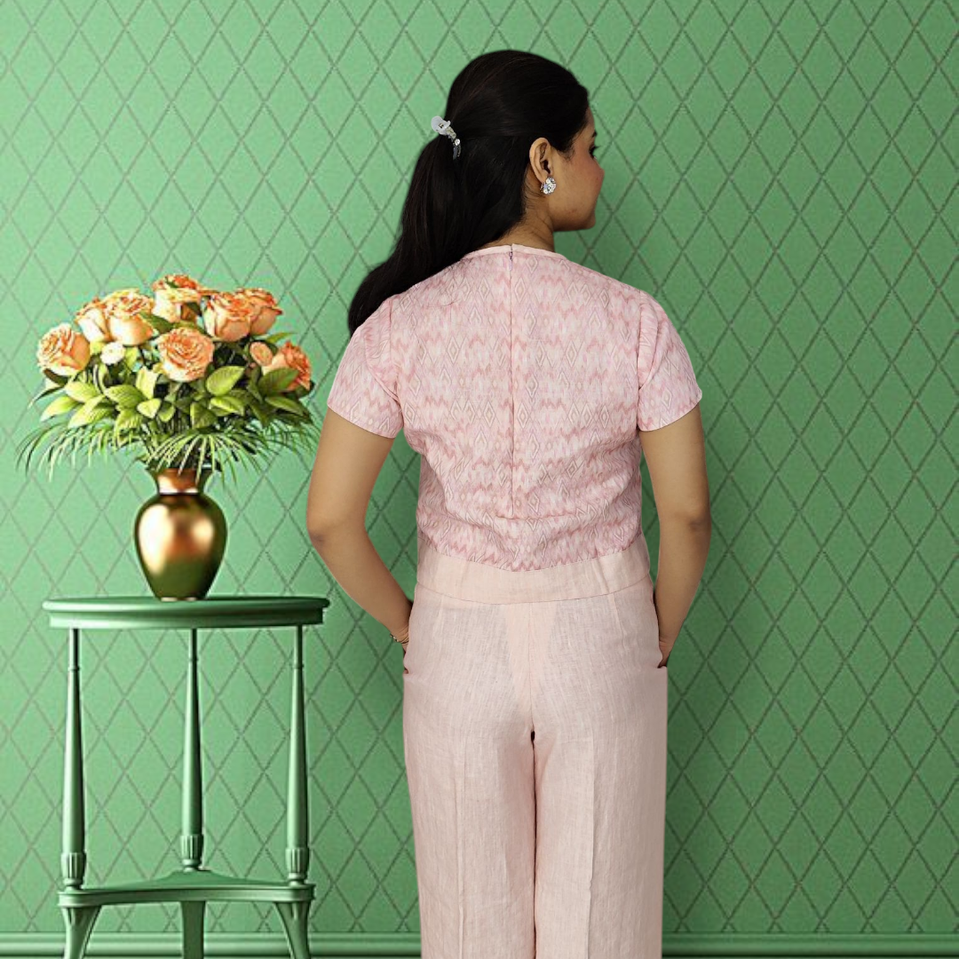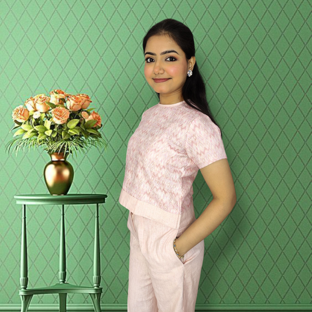 This Blush Mood Pure Linen Co-ord features a light pink hue paired with a modern ikat print on the tailored straight-leg pants, crafted from breathable pure linen. The outfit is fully lined to ensure opacity and comfort, delivering a flawless fit that combines style with practicality. Ideal for those seeking a sophisticated yet effortless look.