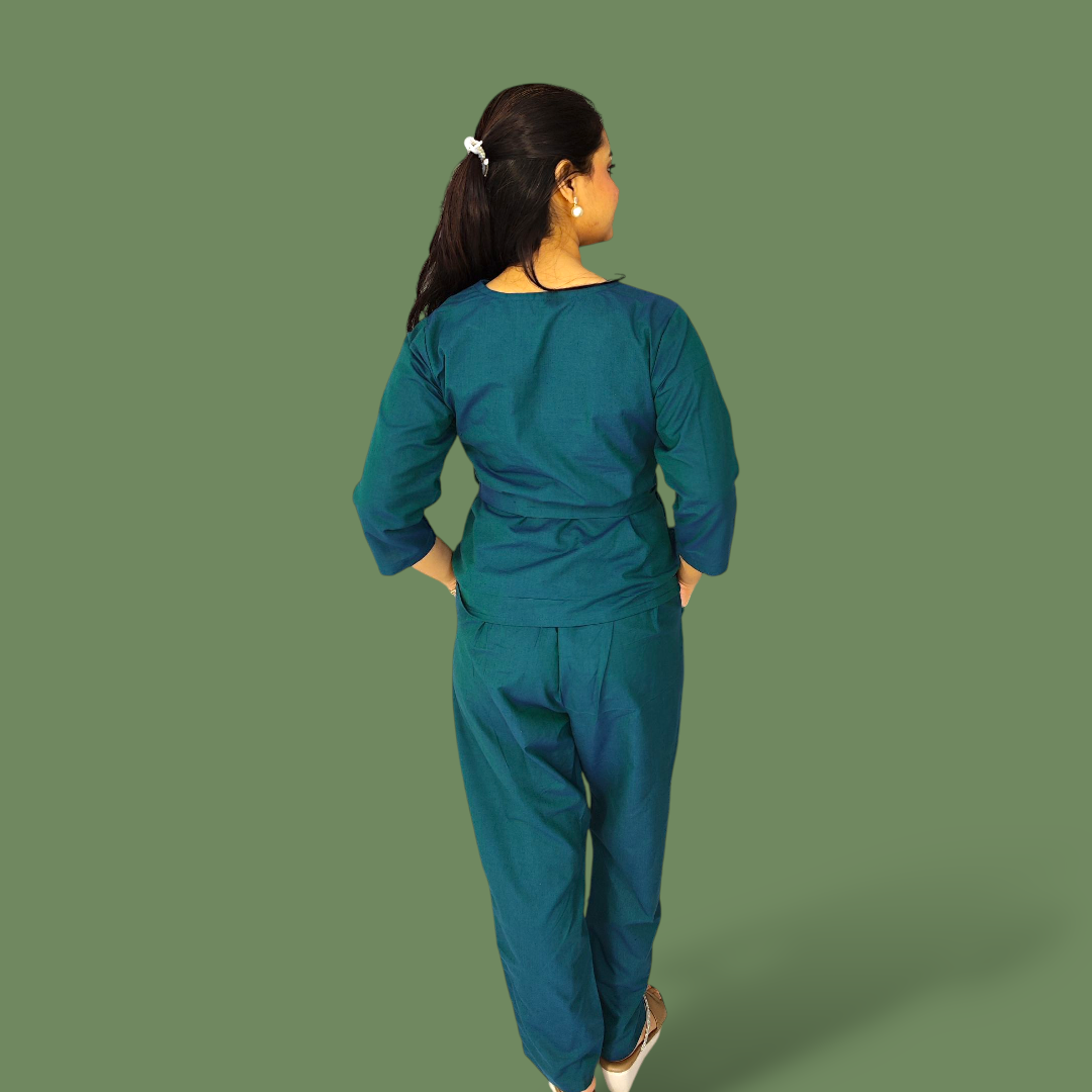 This scallop detail co-ord set features a refined cotton fabric that ensures comfort and breathability. Designed with 3/4 sleeves and a coordinating fabric belt to tie at the waist, it offers a flattering silhouette and effortless style. Ideal for those seeking a polished yet relaxed look, this set combines thoughtful design with everyday wearability.