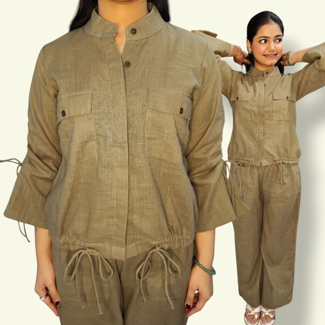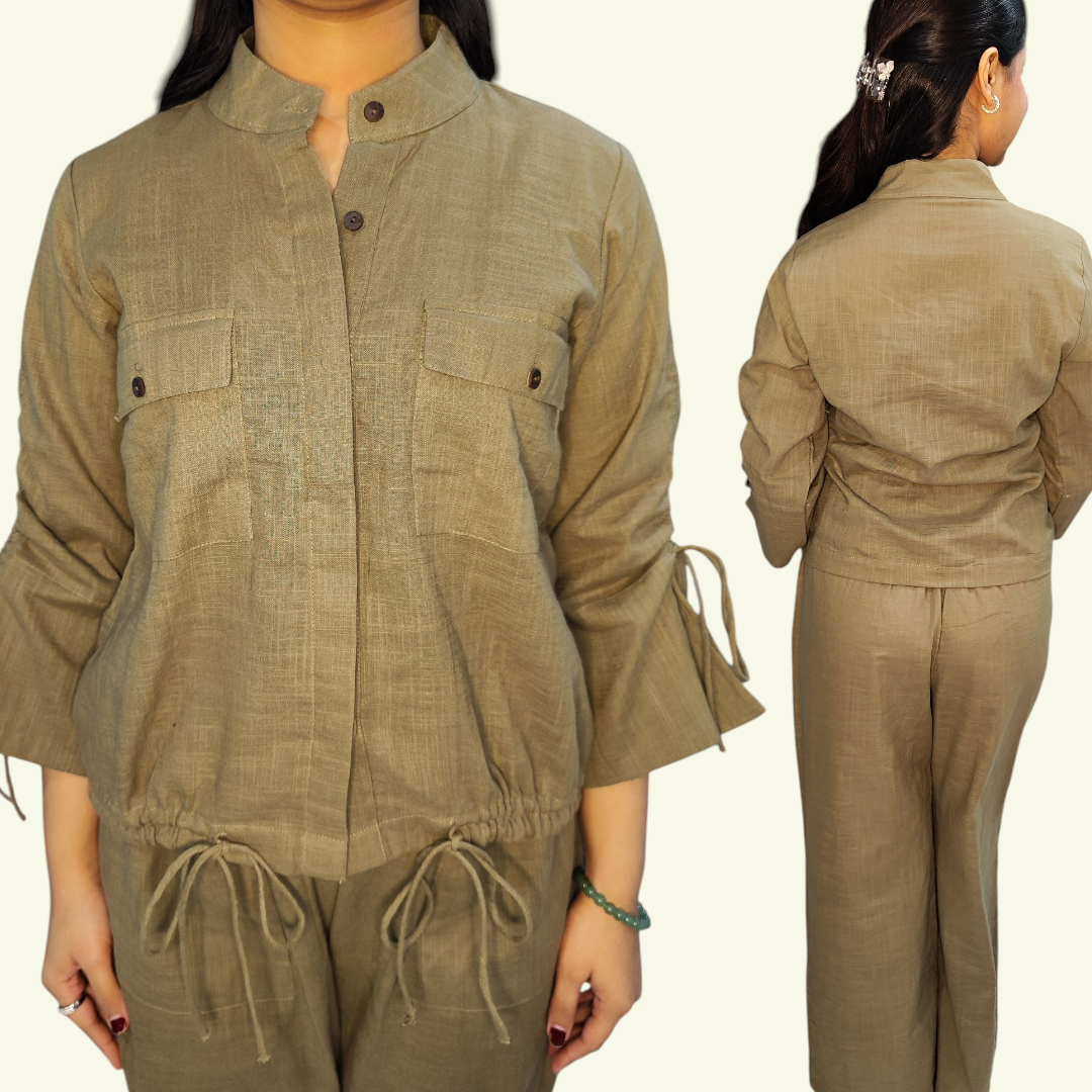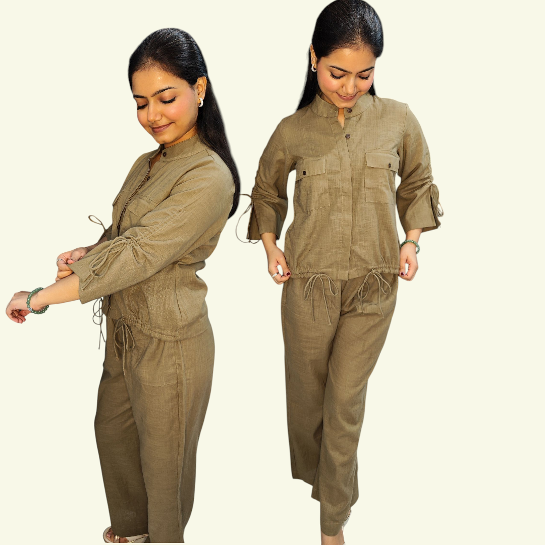 This brown sporty co-ord set combines comfort and style with breathable cotton linen fabric, perfect for 2025’s trending color palette. Featuring wooden buttons, practical chest pockets, and adjustable drawstrings at the arms and waist hem, it offers a tailored fit and functional design ideal for an active lifestyle.