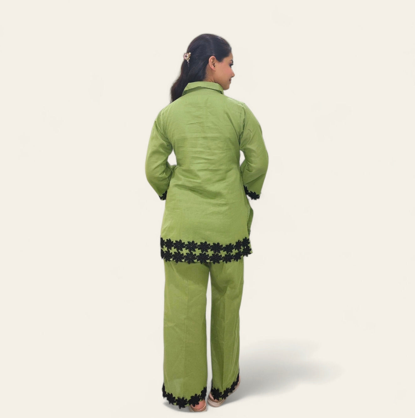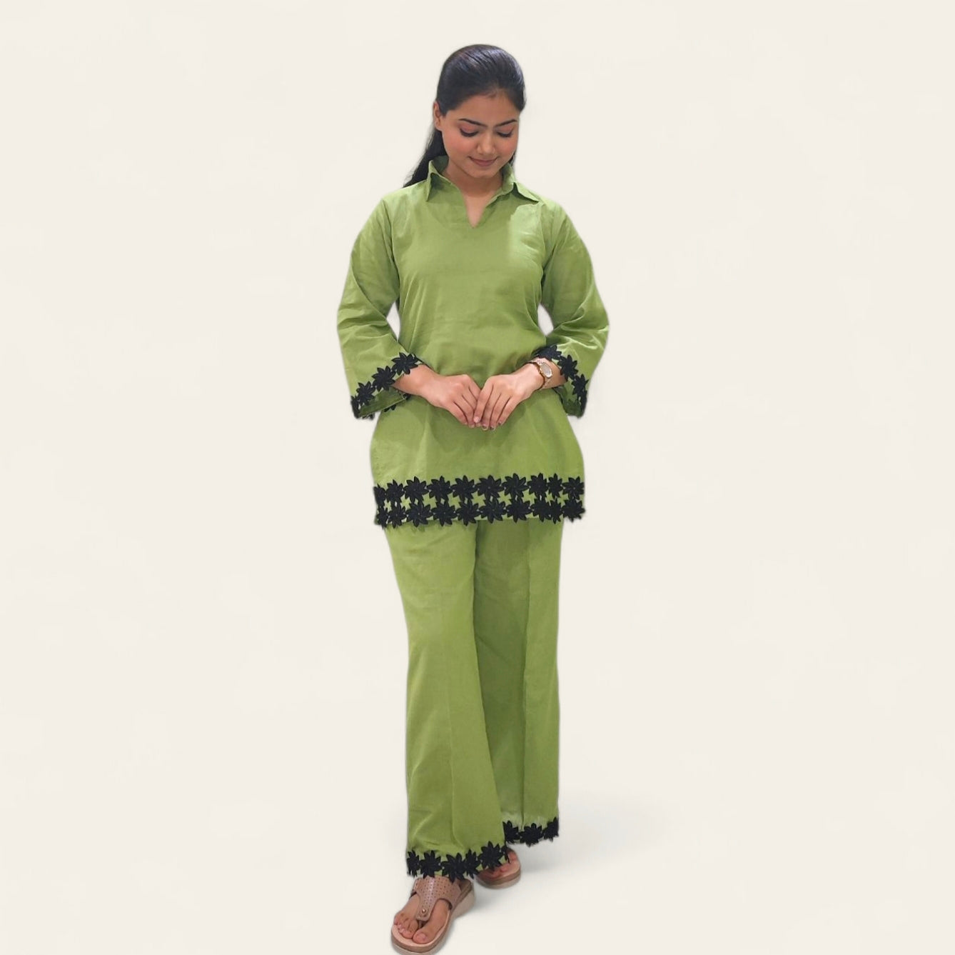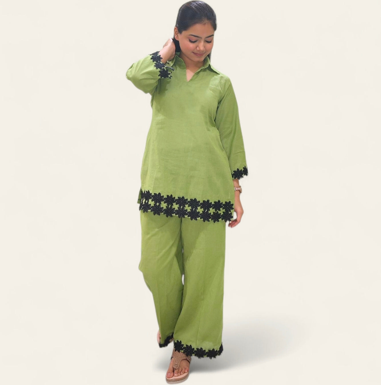 Introducing the Bhagyashree Cotton Linen Set - a stunning and elegant ensemble inspired by Bollywood celebrity Bhagyashree. The green colour and black lace border detail add a touch of glamour to this set, making it perfect for any occasion. Made from high-quality cotton-linen, this set guarantees both style and comfort.