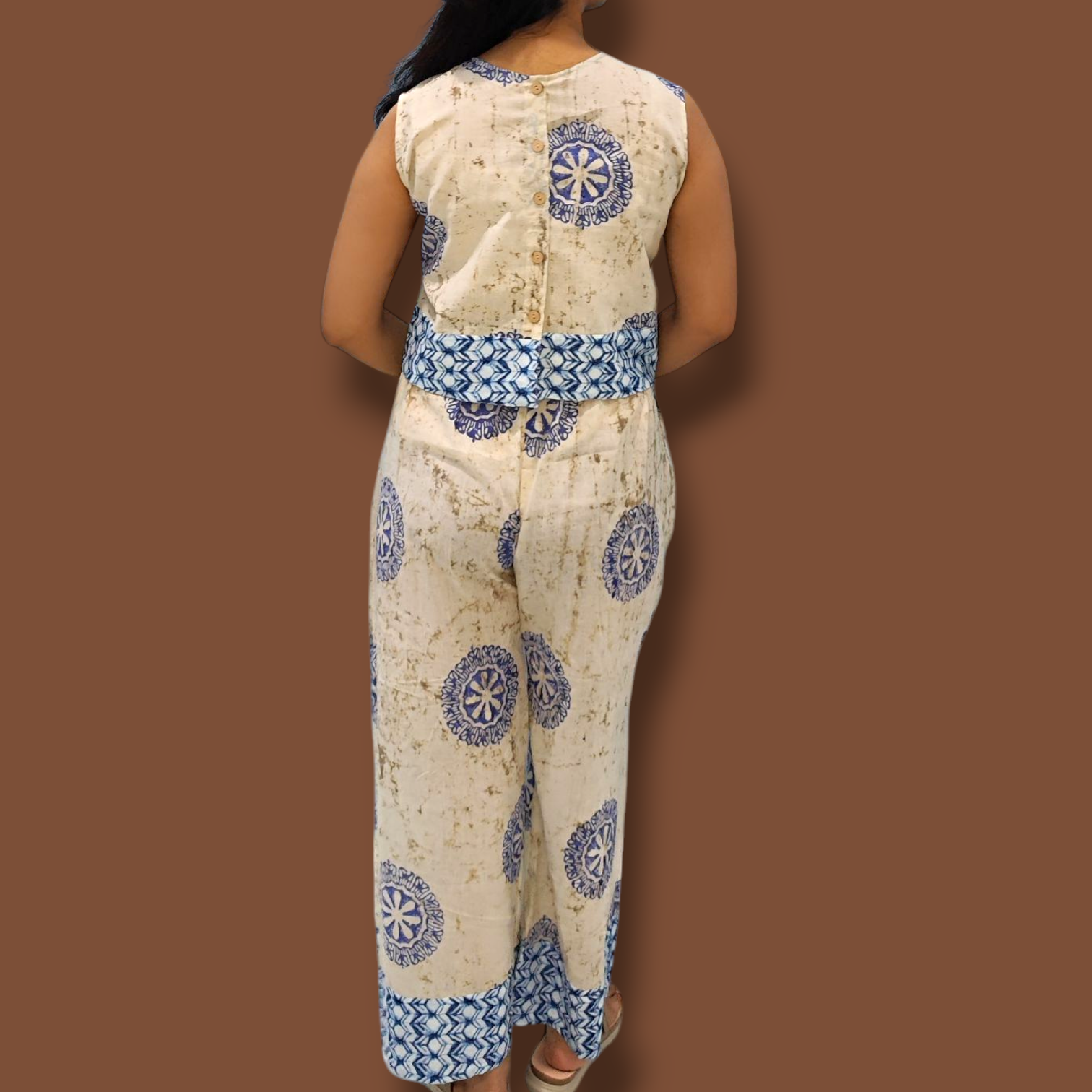 This pure cotton crop top set features a unique combination of tie and dye and block print. Made for comfort and style, it is perfect for any casual or semi-formal occasion. Elevate your wardrobe with this vibrant and versatile piece.