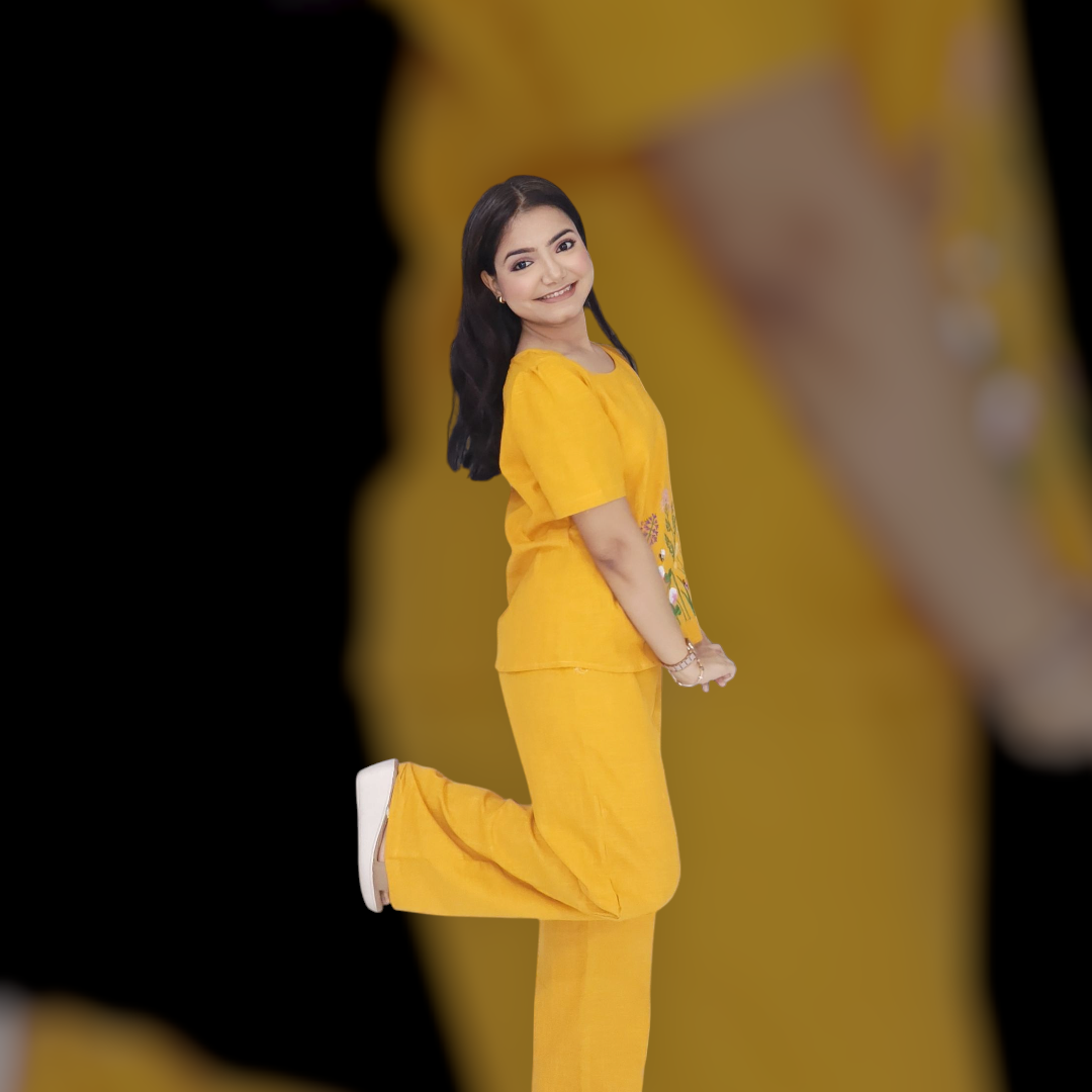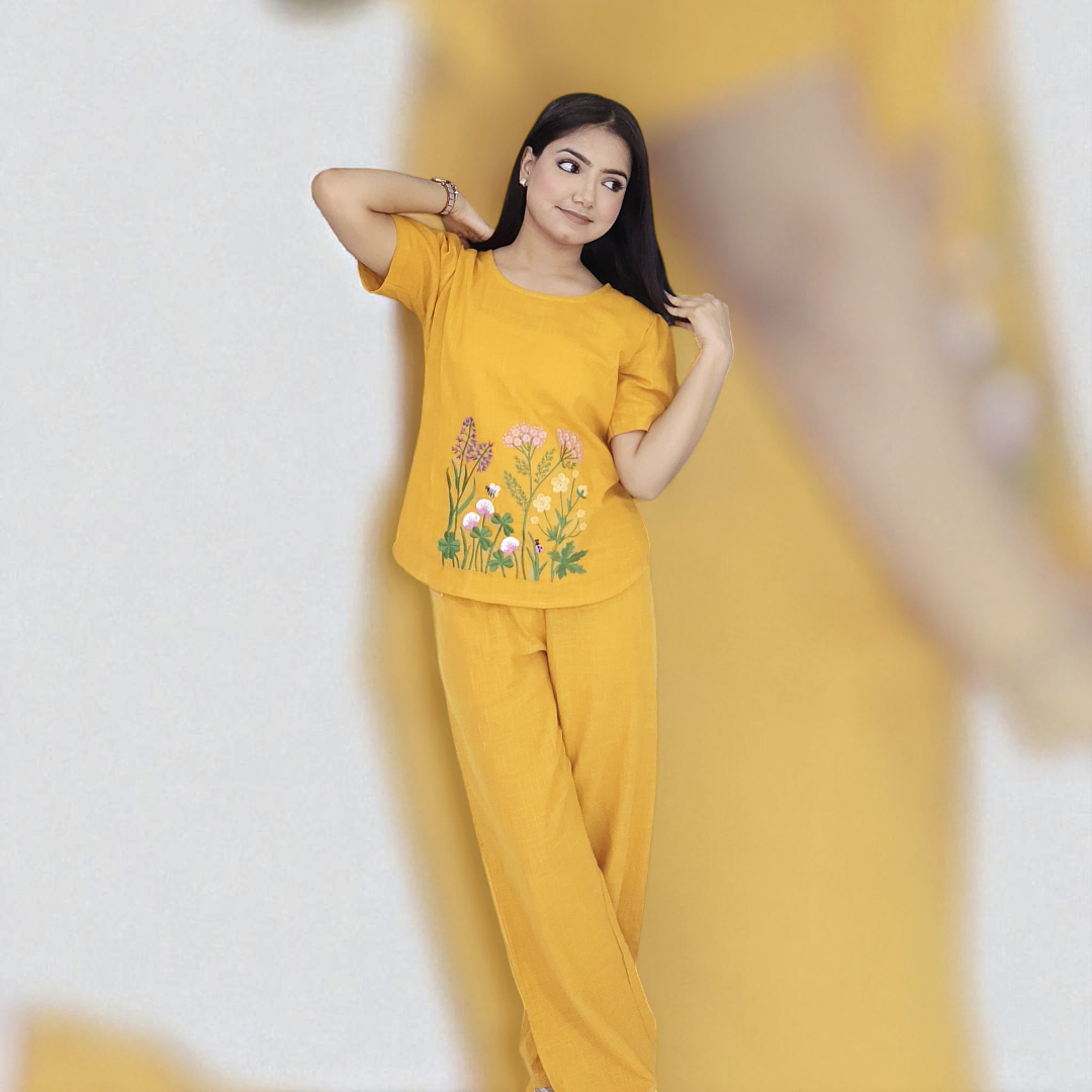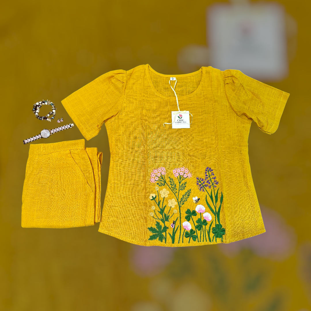 Crafted from pure cotton, this Embroidered Top Co-Ord Set features breathable straight-leg pants paired with a finely machine-embroidered top. The natural fabric ensures comfort and durability, while the detailed embroidery adds a sophisticated touch, making it ideal for both casual and semi-formal occasions.