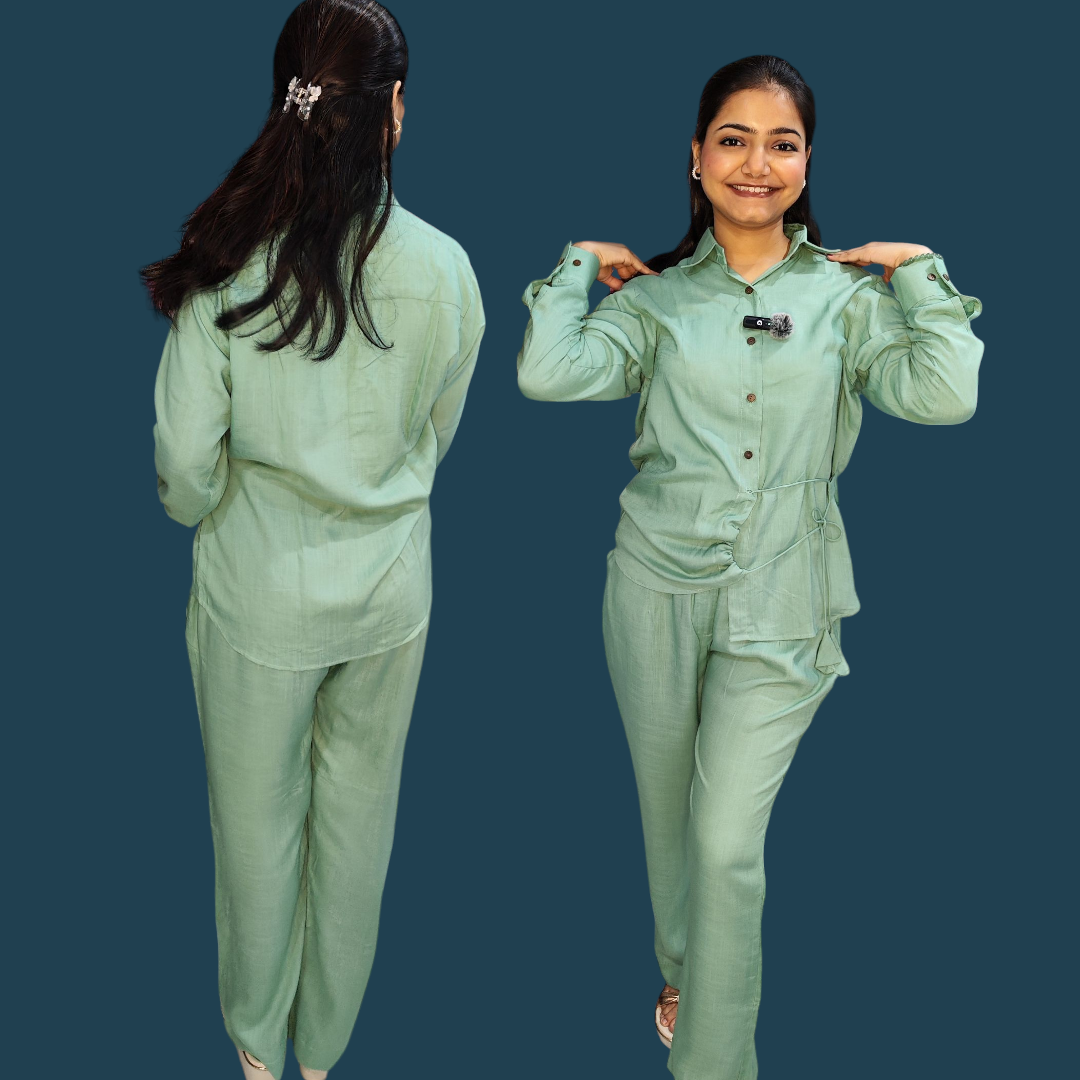 Expertly crafted from a luxurious viscose linen blend, this co ord set boasts a sophisticated tie up detail on one side of the shirt. The full sleeves and wooden buttons add an elegant touch, making this a versatile and timeless addition to any wardrobe.