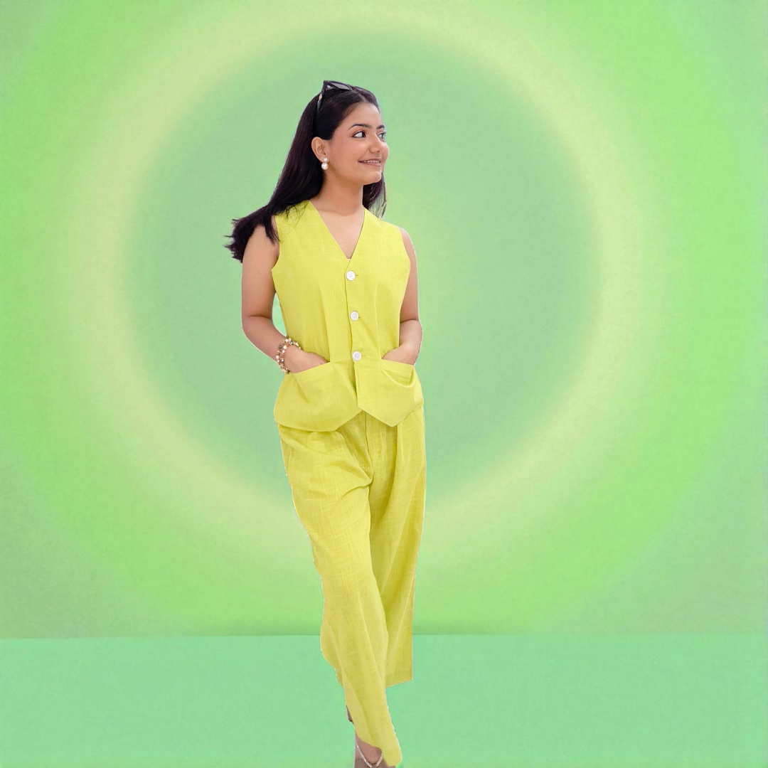 This lime green sleeveless waistcoat co-ord set is crafted from breathable cotton linen, combining comfort with style. Featuring prominent white buttons, the waistcoat offers a modern, tailored look, while the easy-fit pants provide relaxed wearability. Ideal for warm weather, this set balances vibrant color and natural fabric for a sophisticated yet effortless outfit.