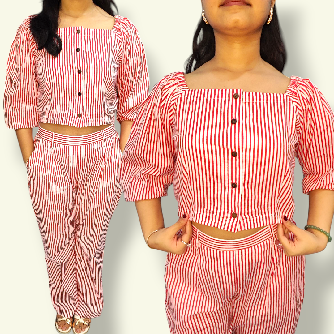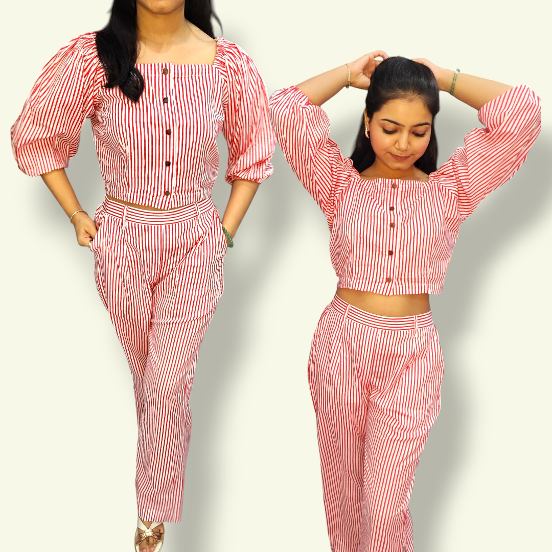 This striped print co-ord set in pure cotton combines style and comfort effortlessly. The crop top features a square neckline, puff sleeves, and wooden buttons for a refined finish. Paired with straight-leg pants that include belt loops and a back elastic waistband, this set offers a flattering fit and ease of wear. Perfect for a polished yet relaxed look, it embodies a trendy, Pinterest-worthy aesthetic ideal for casual outings or stylish daywear.