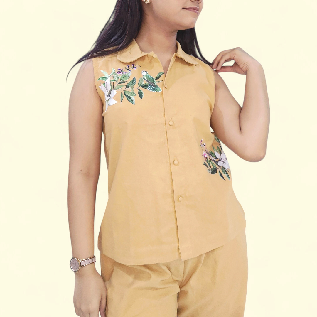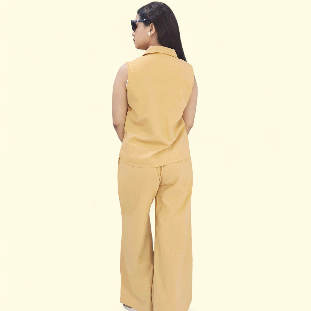 This yellow placement print sleeveless co-ord set features a breathable pure cotton fabric, ensuring comfort throughout the day. The set includes a stylish sleeveless top paired with straight-leg pants, offering a modern silhouette that balances ease and elegance. Ideal for warm weather, this coordinated outfit combines vibrant design with practical wearability, making it a versatile addition to your wardrobe.
